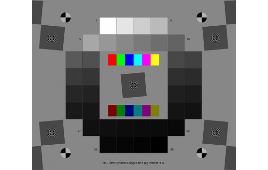 كما أنه يحتوي على حواف مائلة في الوسط وزوايا مع تباين 4: 1 لقياس MTF. تحتوي الحواف على MTF50> = 16 دورة / مم ، وهو أفضل بحوالي 3 أضعاف من أفضل مخططات نفث الحبر. علامات التسجيل تجعل المناطق سهلة التحديد. تساعد الخلفية الرمادية المحايدة على ضمان أن يكون المخطط مكشوفًا بشكل جيد في كاميرات التعرض التلقائي (مقارنةً بالمخططات ذات الخلفيات السوداء ، والتي يتم تعريضها بشدة في بعض الأحيان).